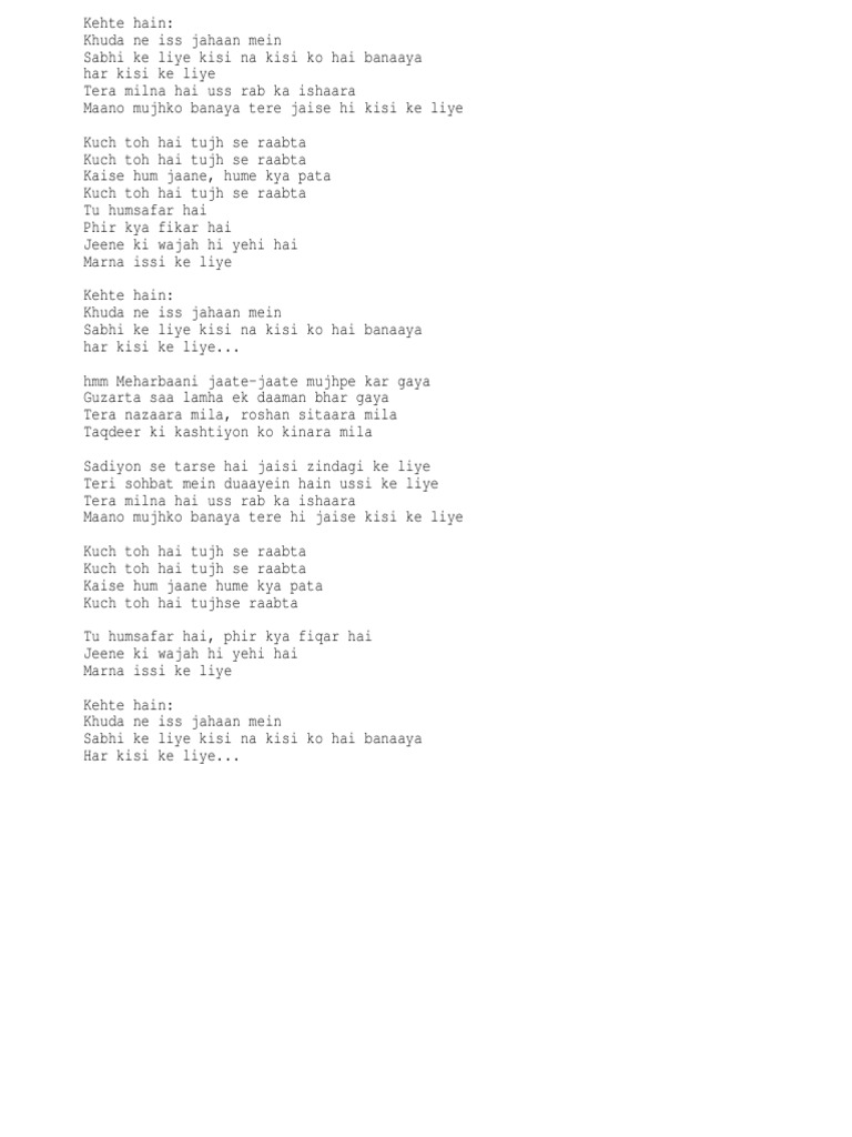 Hindi Songs Lyrics With English Translation Kehte Hain Khuda Ne Is Jahan Mein Sabhi Ke Liye Kisi Na Kisi Ko Hai Banaya Har Kisi Ke Liye Tera Milna Hai Us Rab